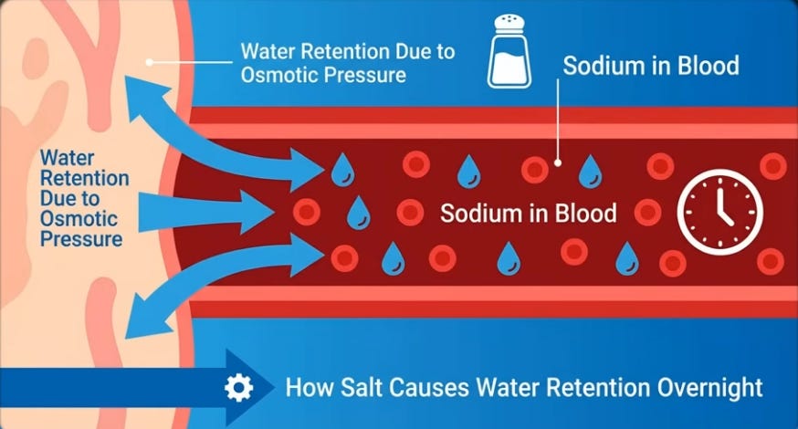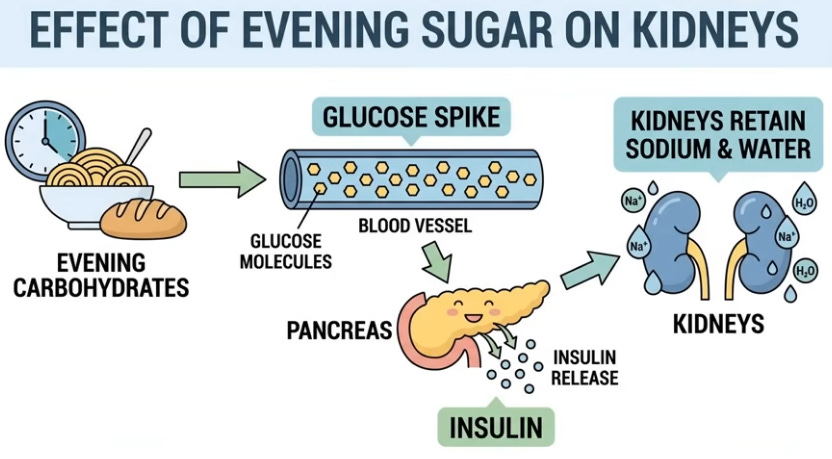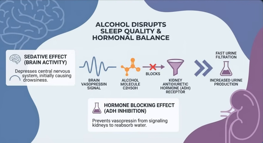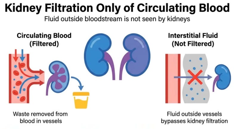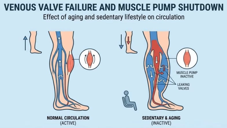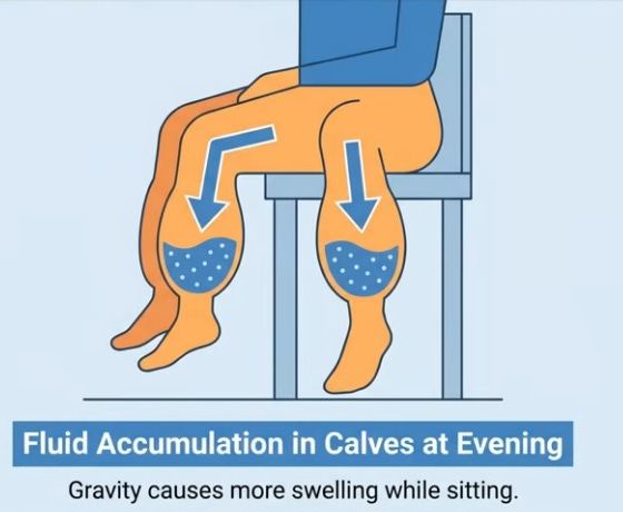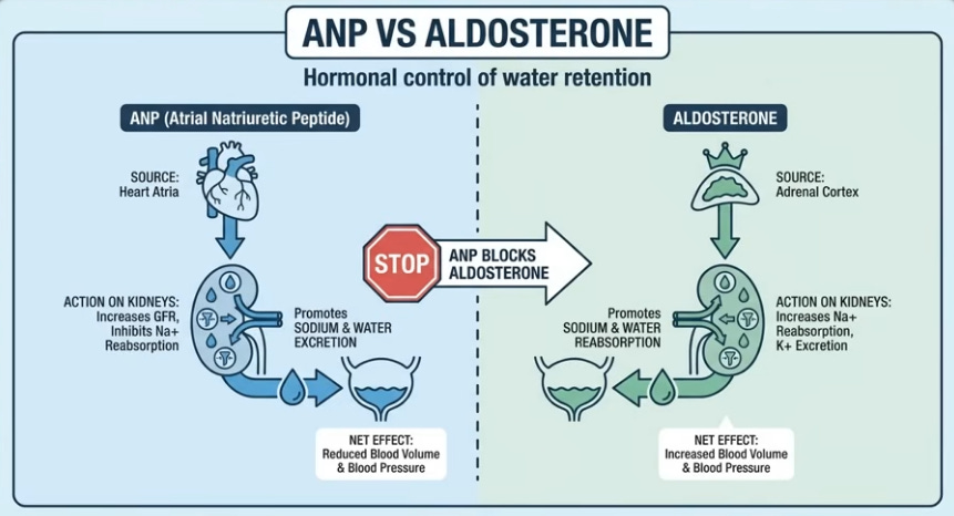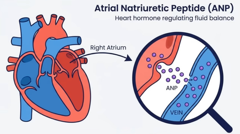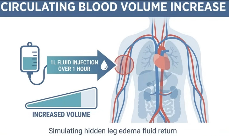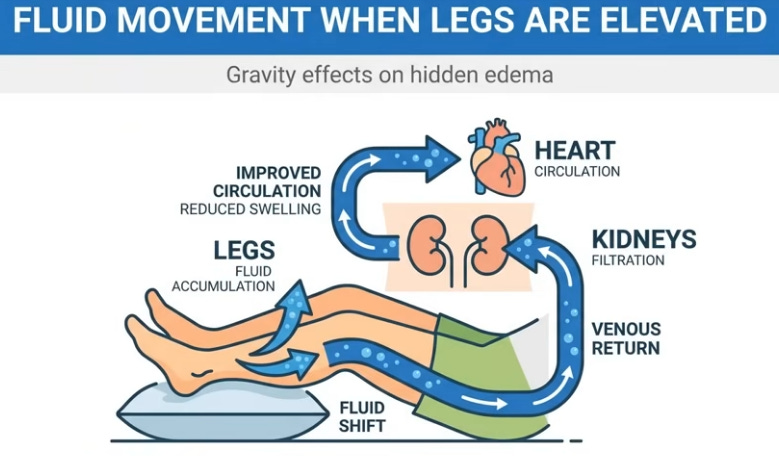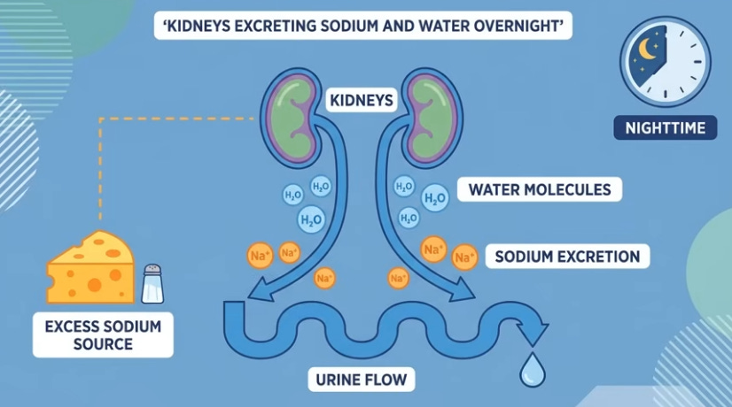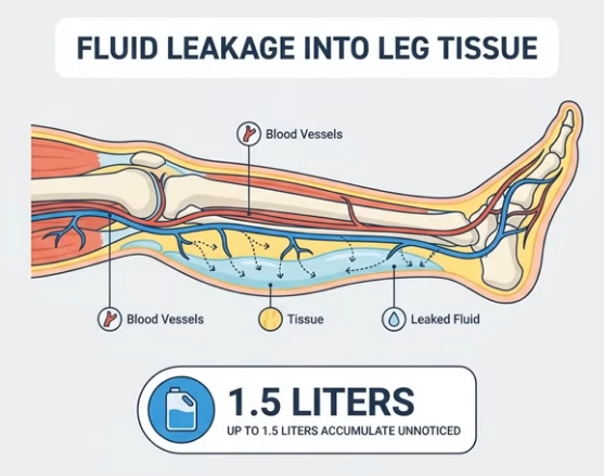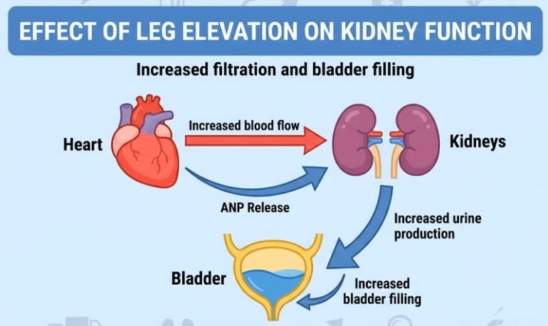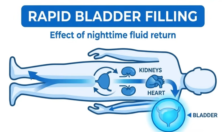 Like water in a bottle shifting when laid flat, 16 vertical hours pool blood, lymph, and interstitial fluid in legs via gravity; youthful elastic veins and muscle pumps resist, but age/sedentary life weakens valves, leaks fluid (up to 1.5L) unnoticed beyond sock marks. Evening salt-heavy dinners exacerbate; lying down levels legs with heart/kidneys, reabsorbing fluid spikes blood volume, stretching the atrium to release atrial natriuretic peptide (ANP), blocking water retention and forcing kidneys to dump fluid/sodium urgently, filling the bladder hourly despite no intake—legs literally “drinking” for you.