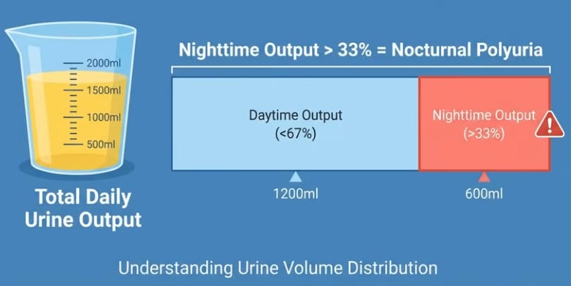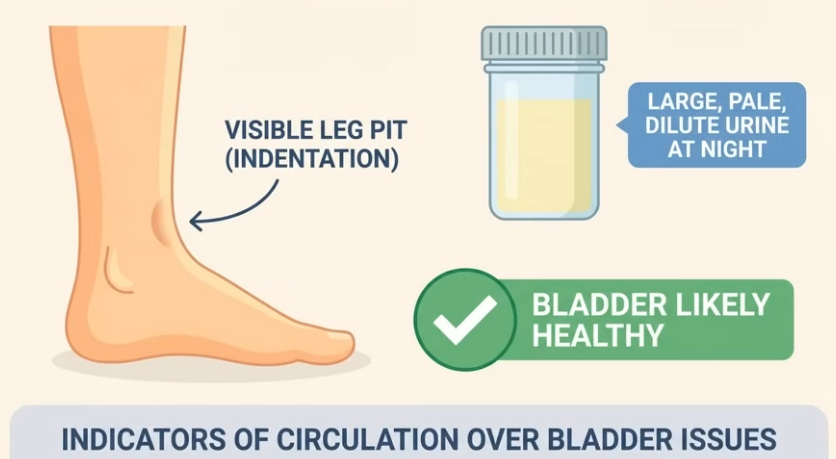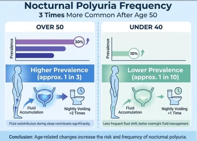 Nocturnal polyuria—excess nighttime urine production affecting 60-70% over 50—triples in prevalence post-50 due to aging vein/valve weakening, causing subtle leg edema (1-1.5L fluid pooling daytime) that floods kidneys upon lying down, triggering wake-ups. Tonight, test via shin pit-press (thumb dent on lower leg), urine diary (>33% night output), salt-free dinner (skip cheese/meats), 15-20 minute leg elevation {Mikulin’s vibrational exercise} before bed (drain while awake), and 20-30 Kegels (perineum squeezes). Leg pit + breathlessness? See cardiologist first for heart or sleep issues; bladder is just signaling—fix root causes physiologically, not symptoms.