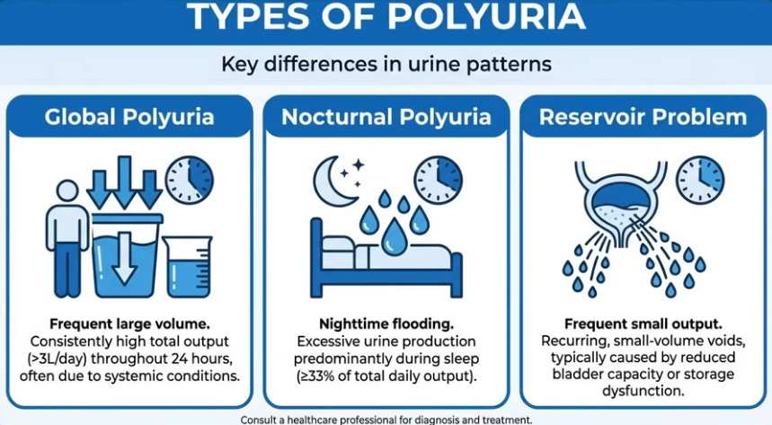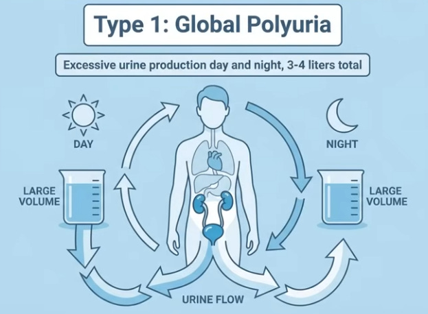 Urology classifies nighttime issues into three types with distinct treatments: Type 1, global polyuria, involves excessive overall urine (3-4 liters/24 hours) from overdrinking or diabetes (type 2 or insipidus), with pale, frequent voids day and night needing endocrine evaluation. Type 2, nocturnal polyuria (60-70% of over-50s), is insidious—normal daytime but nighttime flooding despite low evening intake—as kidneys shift to night mode. Type 3, reservoir dysfunction, features urgent, frequent small-volume voids from overactive bladder, prostate enlargement, infections, or stones; bladder can’t hold 200-300 ml normally. Identify yours: large volumes day/night (global), normal day/flood night (nocturnal), urgent tiny amounts (reservoir).