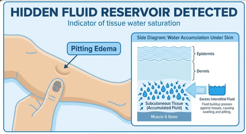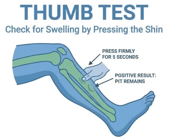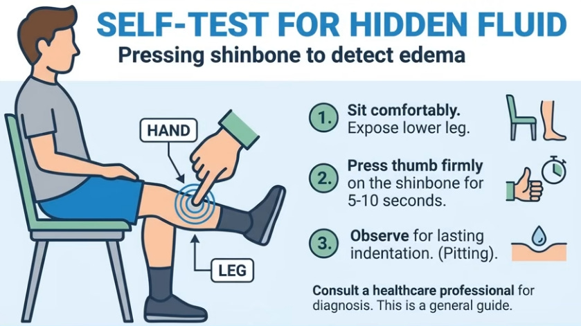 Test 1: Press thumb on shin bone (knee-ankle) 4-6 inches above ankle for 10-15s; lingering pit indicates saturated tissues. Test 2: Track 24h urine; >33% nighttime (e.g., 500ml of 1500ml) confirms nocturnal polyuria from redistribution. Positive tests mean focus on circulation, not bladder.
