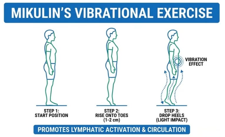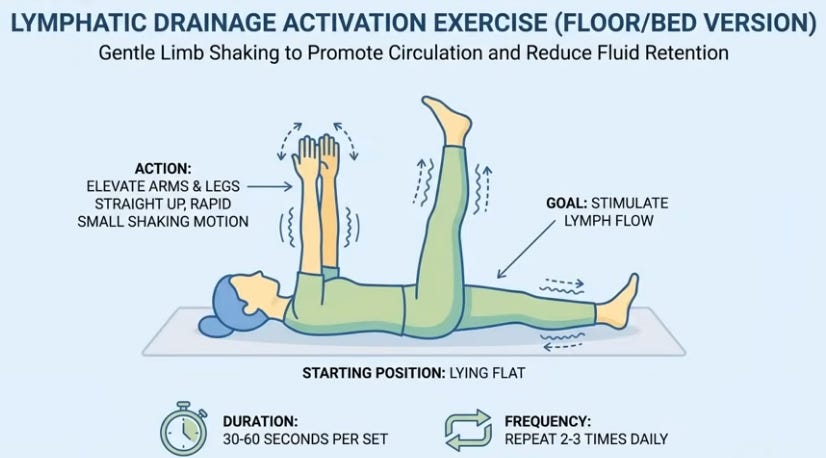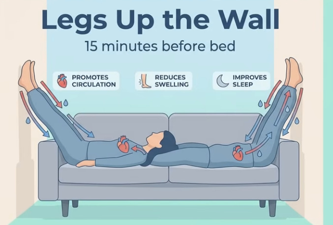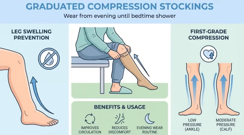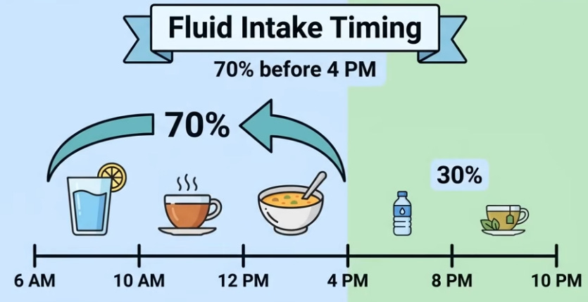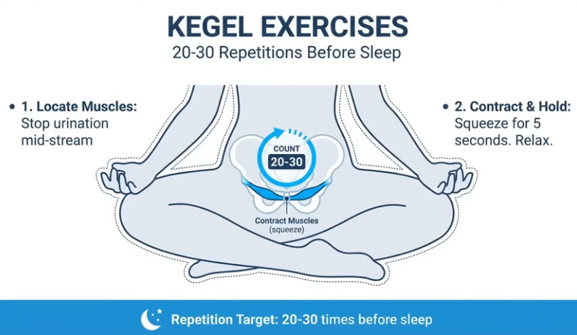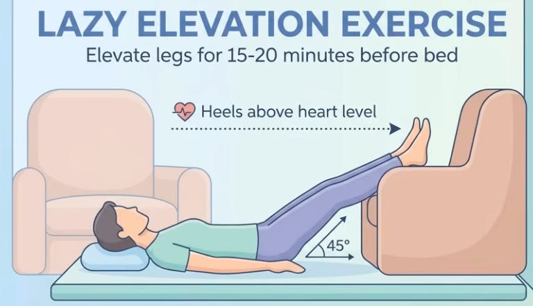 Morning: 30 heel drops (toe rise/drop for calf vibration activating vein valves) or bed leg/arm shakes for lymph. Day: 70% fluids pre-4 p.m., table salt ban (cook only, cuts 20-30% intake). Evening: 1-1.5h pre-bed, 15-20min legs elevated >heart (45° on couch/wall) to preemptively drain 300-400ml while awake; compression stockings if swollen; bed Kegels (20-30x pelvic floor “elevator” holds, abdomen relaxed). Anatoli slept through after consistency; cardiologist noted leg/heart improvement.