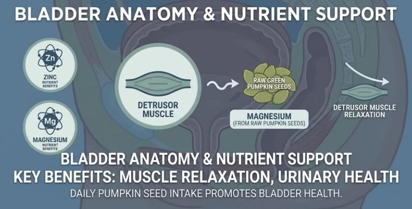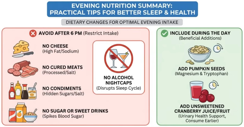 Evening hidden salt (80% from cheese, meats, mayo—100g cheese = chip bag sodium) triggers retention then overnight excretion pulling water; sugar spikes insulin/sodium hold, rebound diuresis, osmotic pull; alcohol sedates but blocks vasopressin for unrestricted filtration, worsening bursts. Allies: 30g raw pumpkin seeds (zinc/magnesium relax detrusor, phytosterols support pelvic floor); unsweetened cranberry (proanthocyanidins block bacteria irritation); fiber (prevents colon pressure on bladder). Anatoli’s switch cut one trip.